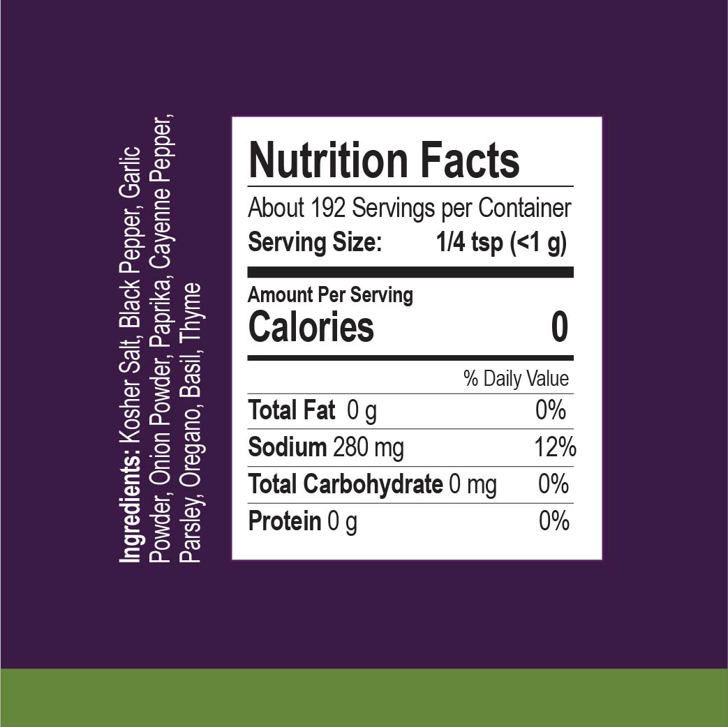 Our Signature Blend combines kosher salt, black pepper, garlic, onion, paprika, cayenne, parsley, oregano, basil, and thyme – all designed to bring restaurant-quality flavor to your home kitchen.